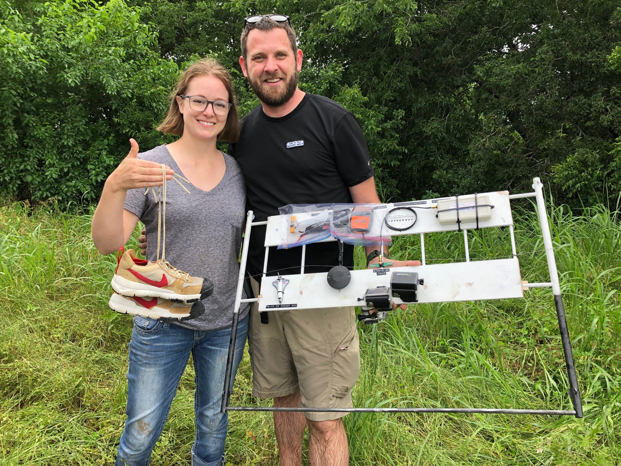 The balloon was a Kaymont 1200 gram latex balloon filled with ~210 cubic feet of Helium. The entire payload weighed ~3100 grams including 3 GoPro cameras, an APRS transmitter (W3ARD-11), SPOT GEN 3 GPS tracker, Pixhawk flight controller (as data logger), my son’s plastic space shuttle, and a pair of Mars Yard 2.5 sneakers.
